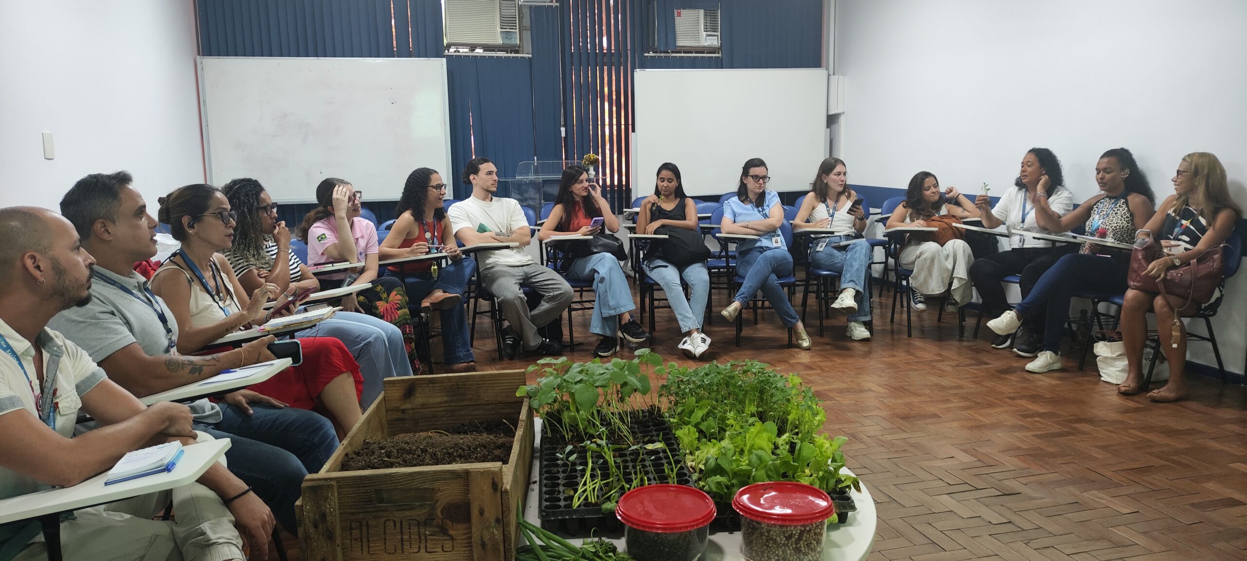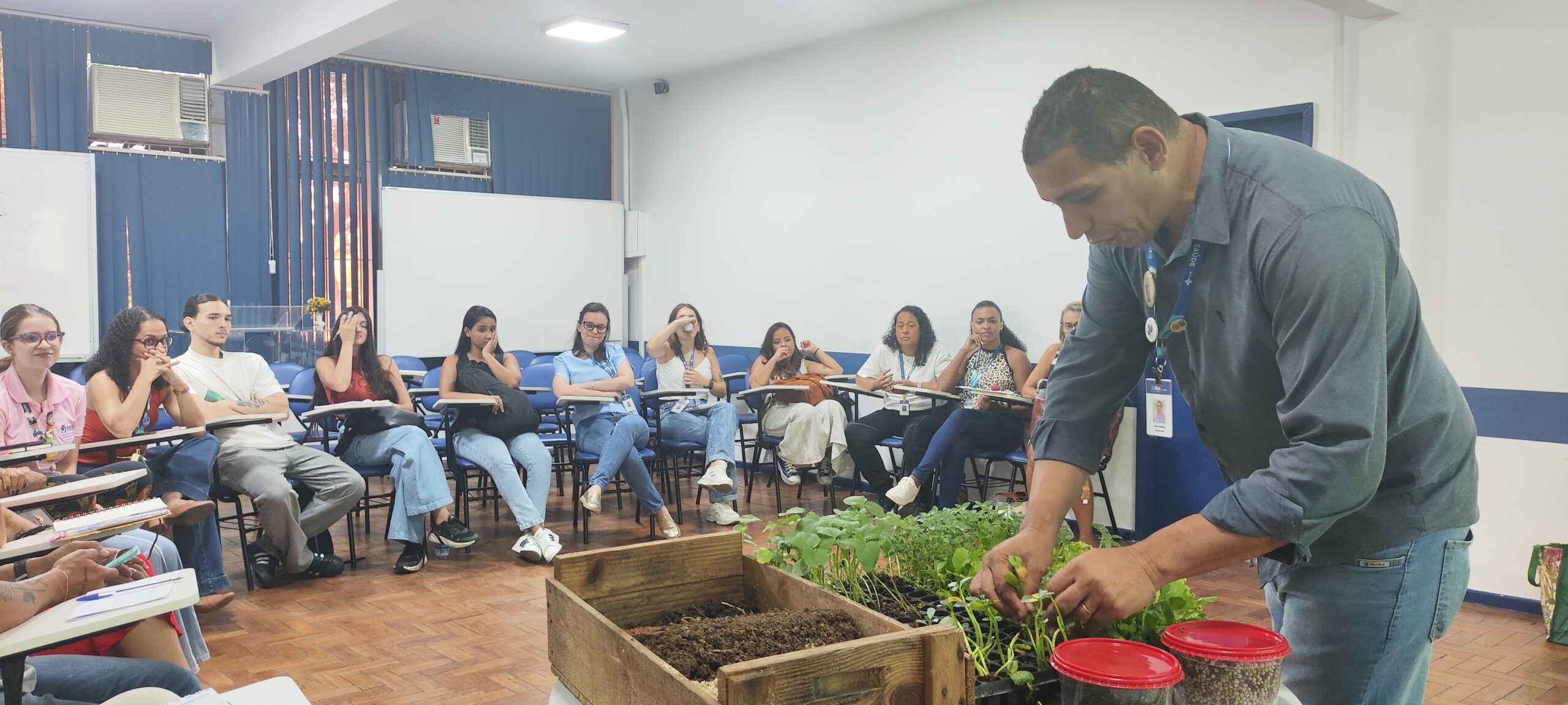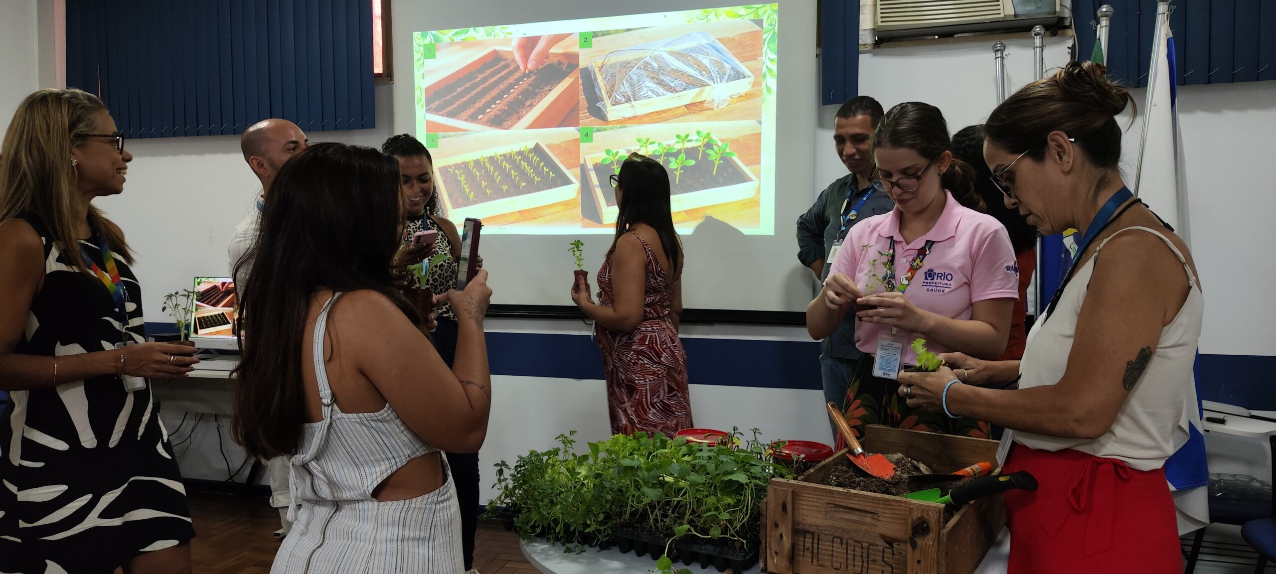 Como parte da programação, os participantes também foram contemplados com uma oficina de horticultura, conduzida pelo biólogo Misael Medeiros, responsável pelas Práticas Integrativas e Complementares (PICS) da CAP 5.1. Durante a atividade, foram abordados conteúdos relacionados ao plantio e cultivo de hortaliças, incluindo alface verde e roxa, salsa, coentro, mostarda e cebolinha. A oficina teve como finalidade incentivar práticas sustentáveis no ambiente das unidades básicas de saúde, promovendo o cultivo de alimentos saudáveis e estimulando hábitos alimentares mais adequados entre os profissionais e suas famílias.